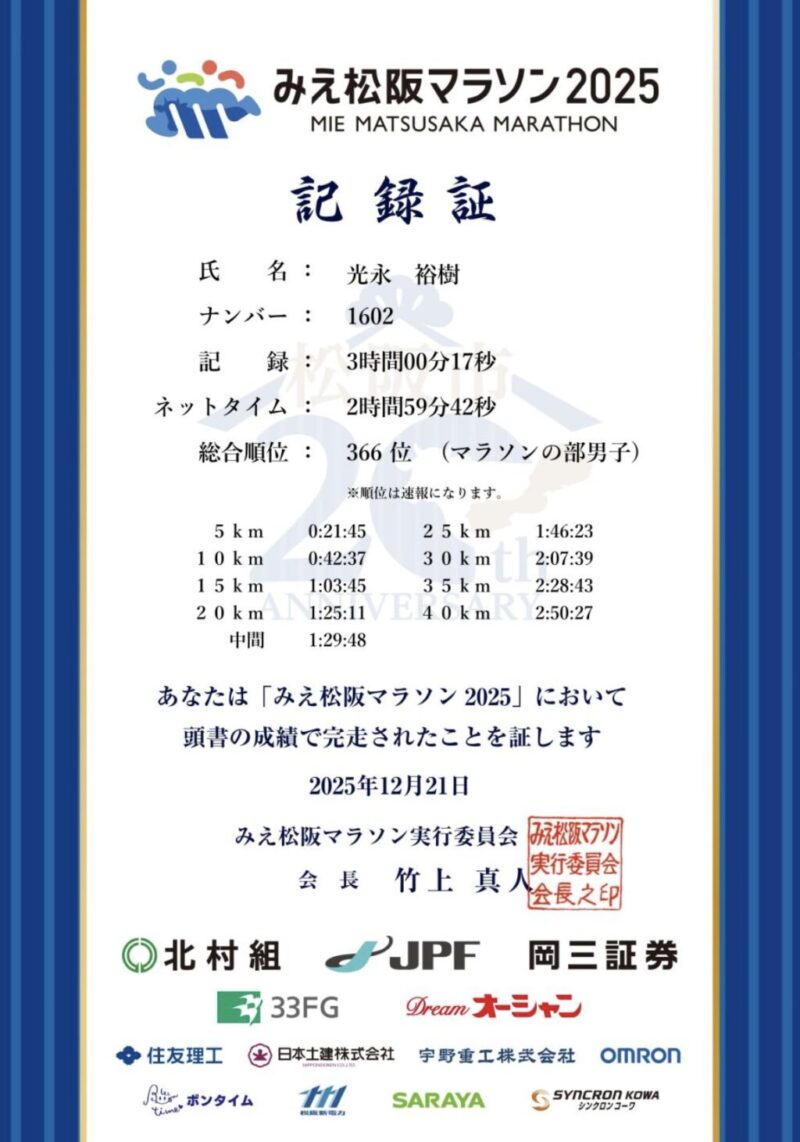 ラン歴13年のみつ @hiroki.mitsunaga(3:07:57)が2025/12/21に開催されたみえ松阪マラソンに参加してきました。