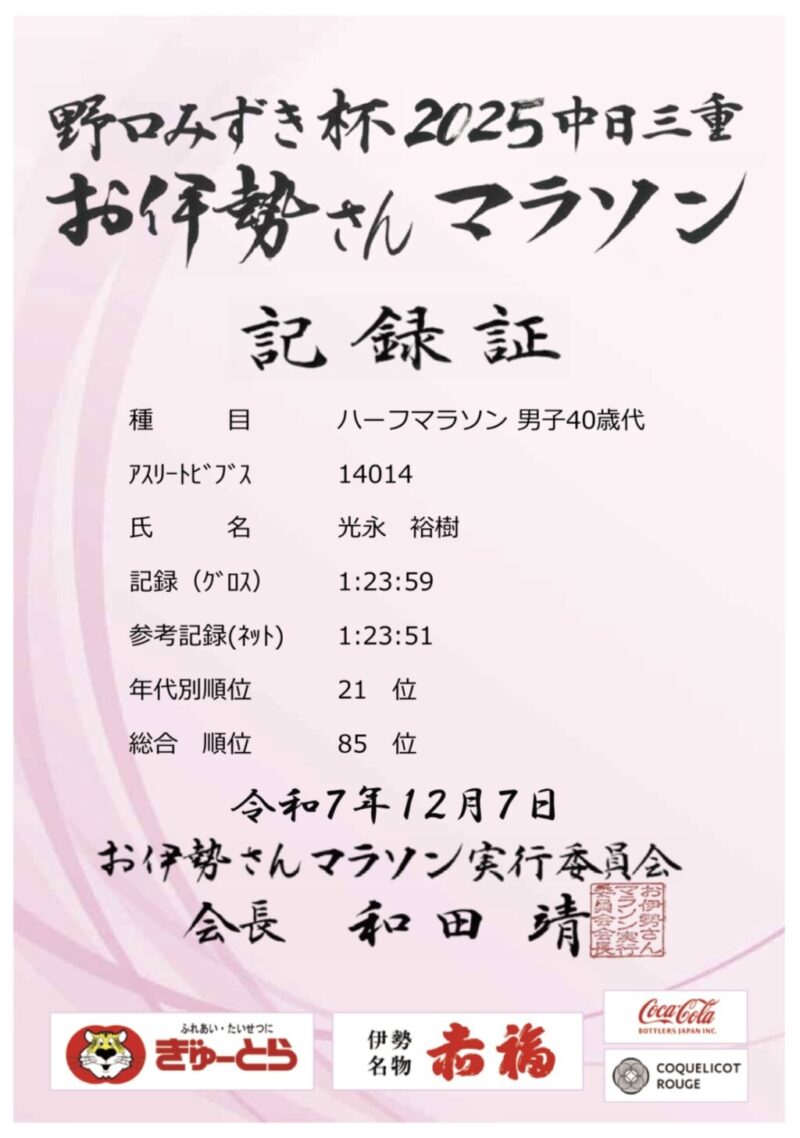 目標だった85分切り、お伊勢さんマラソンで達成できました。