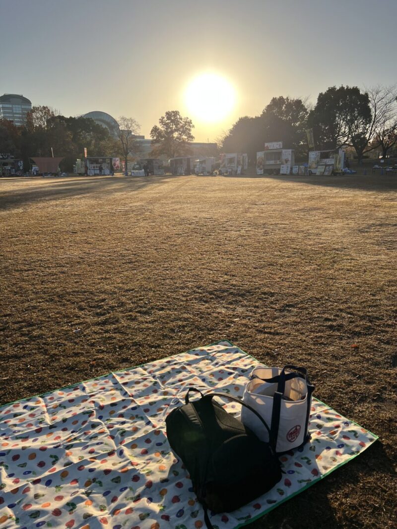 芝生広場にレジャーシートを敷いて気分はピクニック。