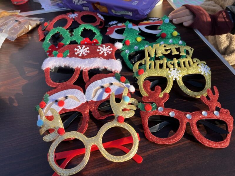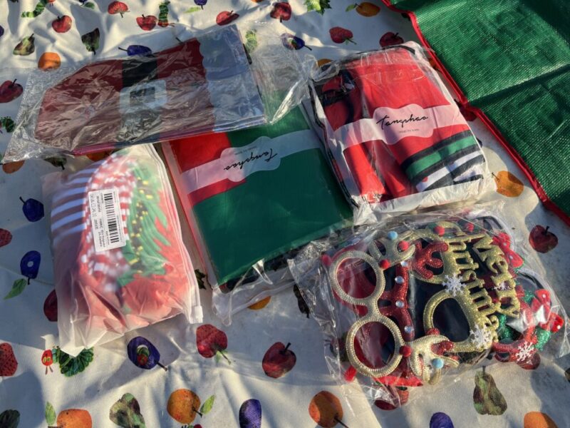 クリスマスの仮装アイテムを並べ、じゃんけんで勝った人から好きなものを選んでいく。