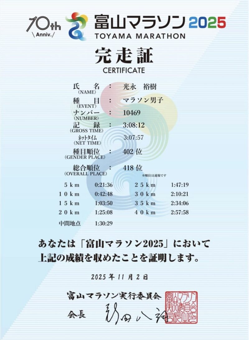 富山マラソン2025の結果になります。